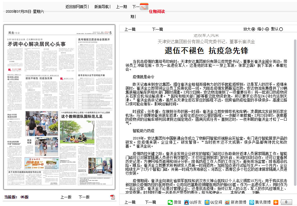 7月25日 《天津日报》 退役不褪色 抗疫显本色